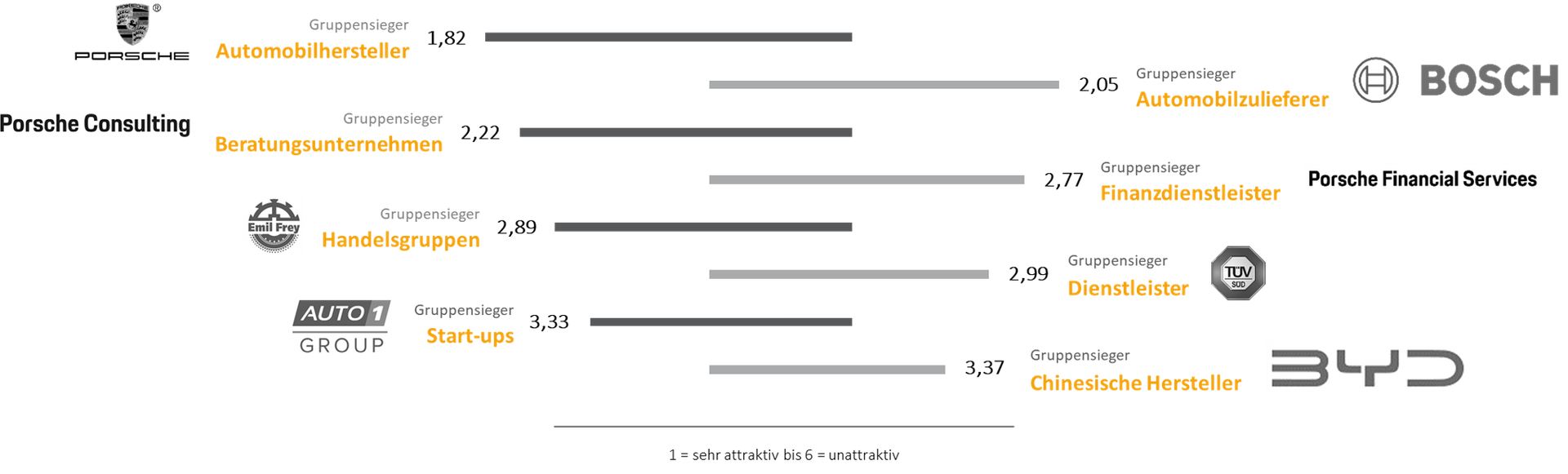 Die Unternehmen der Automobil- und Mobilitätswirtschaft blicken auf eine Arbeitgeberattraktivität auf Branchenniveau von 3,27 (Notenskala von „1 = sehr attraktiv“ bis „6 = unattraktiv“). Im vergangenen Jahr lag diese noch bei 3,26. Die höchste Attraktivität der betrachteten sieben Akteursgruppen können die Beratungsunternehmen verzeichnen (2,83). Attraktivster Arbeitgeber der Branche ist zum wiederholten Male Porsche (1,82). Die Emil Frey Gruppe konnte sich mit der Note 2,89 als attraktivster Händler durchsetzen.